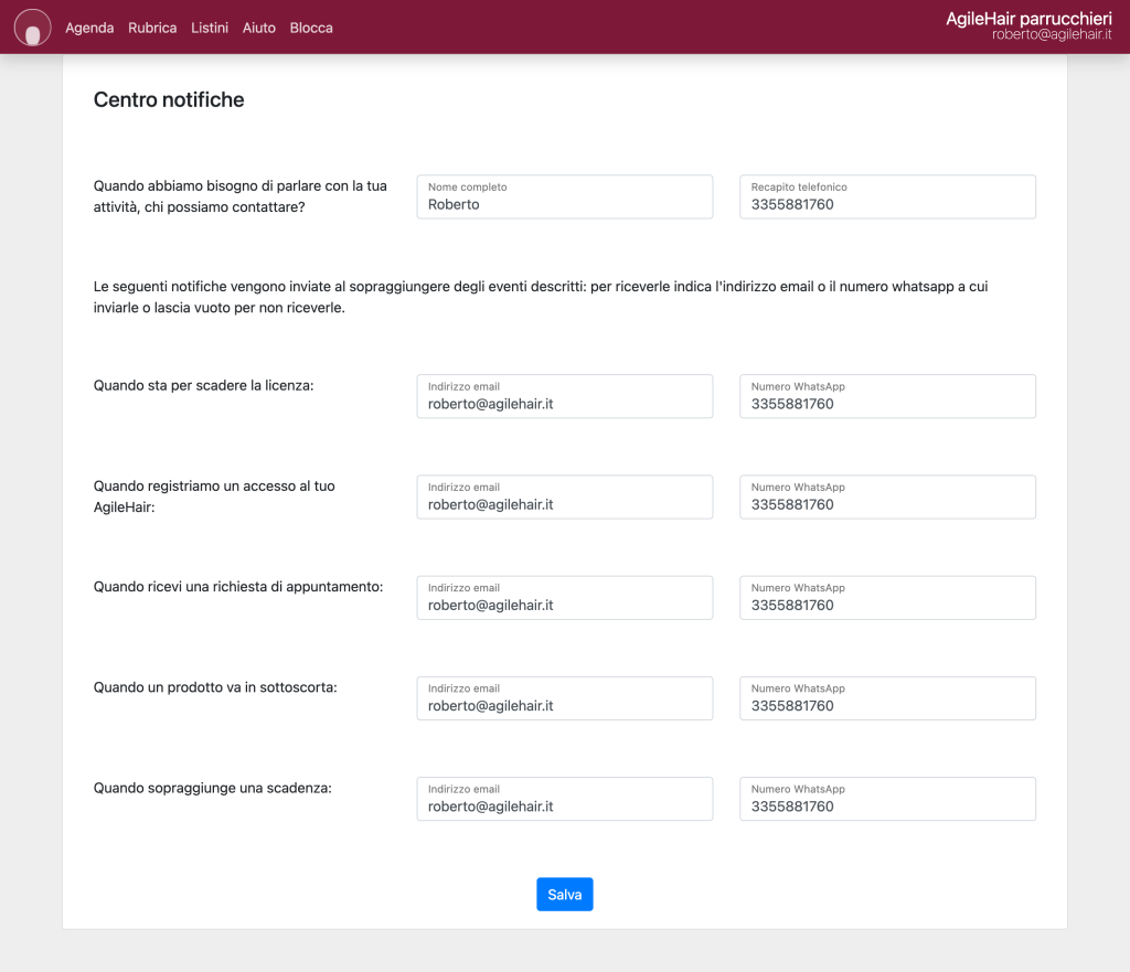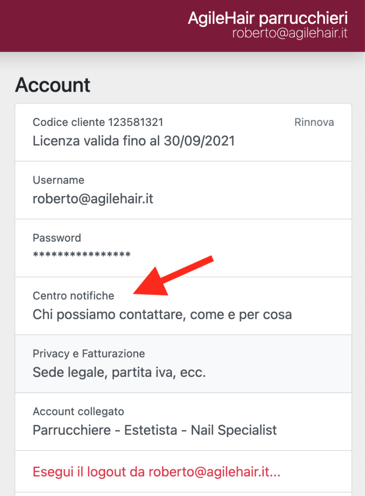 Come per tutti gli strumenti e le impostazioni di AgileHair, anche per il Centro notifiche devi accedere all’area amministrativa, ovvero clicca la tua email in alto a destra e poi dalla sezione ACCOUNT clicca CENTRO NOTIFICHE.
