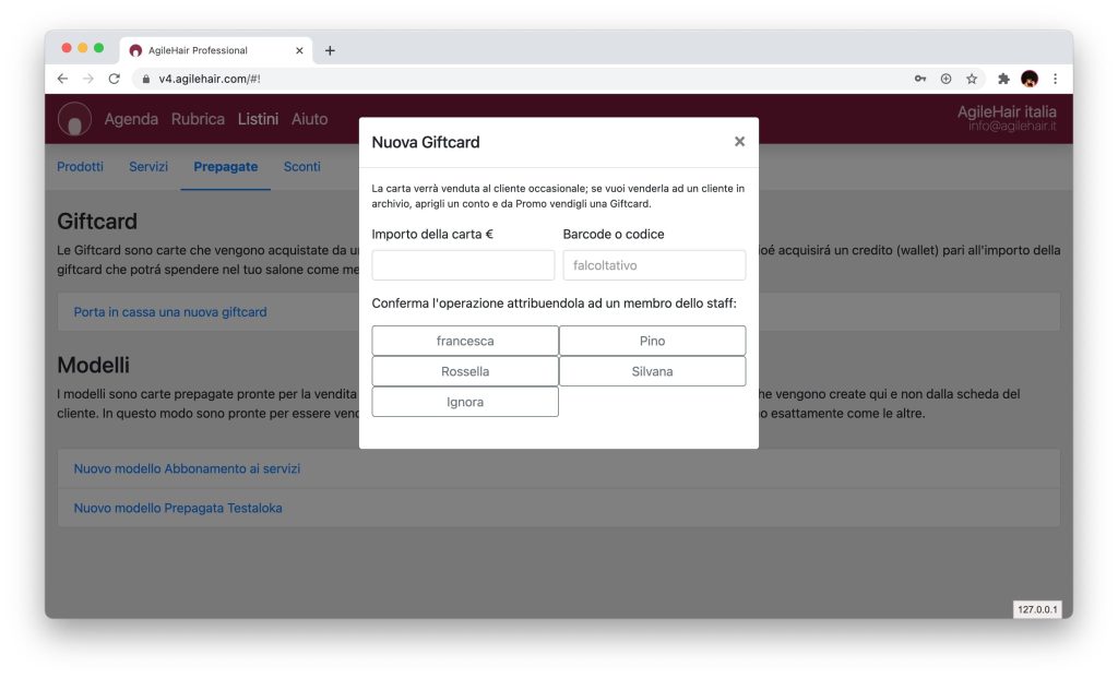 AgileHair gestisce le carte automaticamente: ai fini della gestione è del tutto indifferente che tu dia qualcosa di tangibile al cliente, un biglietto da visita con una firma e l’importo dentro una bustina carina (in fondo è un regalo) o un cofanetto carinissimo con tanto di barcode fatto fare dalla tipografica. La carta può essere venduta in 2 situazioni: