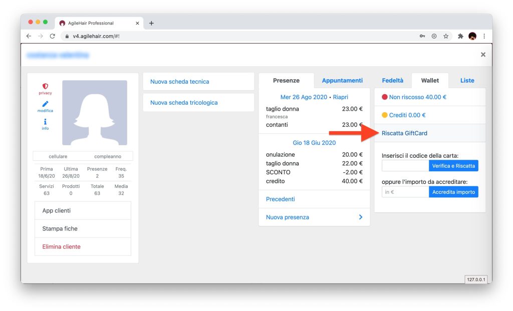Ora entra il cliente che ti mostra la carta che gli hanno regalato (se è un nuovo cliente dobbiamo inserirlo in archivio). Apriamo la sua scheda e nella sezione Wallet clicca Riscatta GiftCard: se hai il codice al riscatto si aggiunge anche l’aggancio alla vendita (il numero dello scontrino…) altrimenti puoi indicare l’importo da accreditare.
