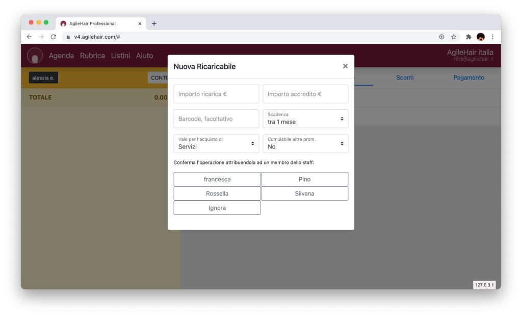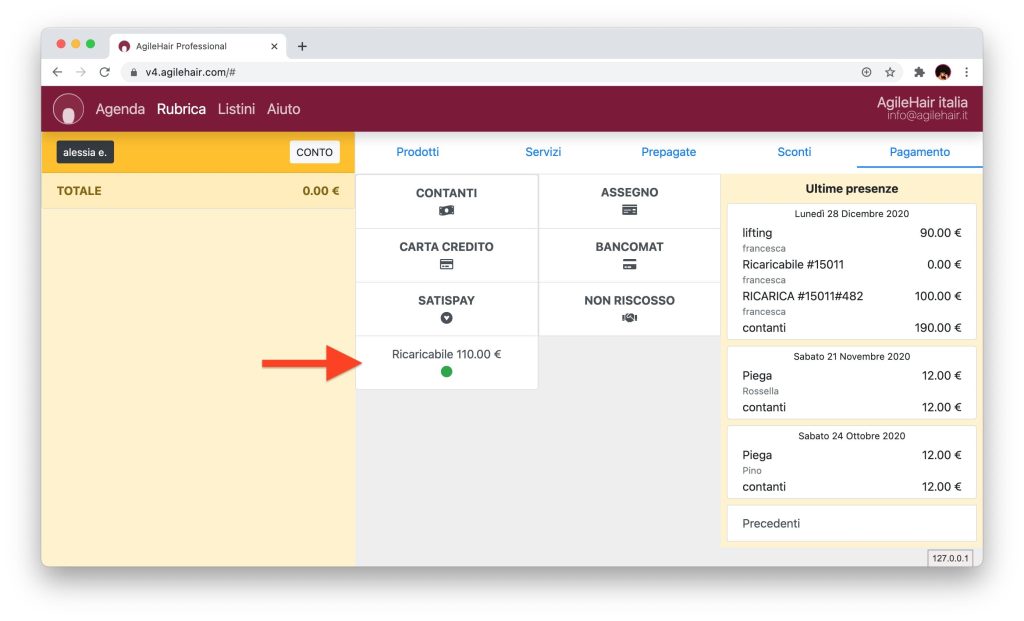 La logica della Carta Ricaribile è molto semplice: premia il cliente accreditando nel suo wallet un importo superiore al costo della carta, ad es. al cliente che ti da oggi 100 euro tu gli accrediti 110 euro, ovviamente da spendere nel tuo esercizio in più volte o per certi prodotti o servizi. Puoi vendere la Ricaricabile aggiungendola al conto dal menu Prepagate indicando: