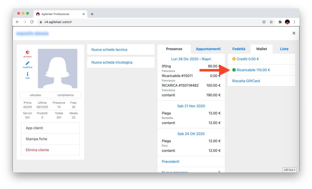 La situazione del credito è consultabile dalla scheda cliente alla sezione Wallet: