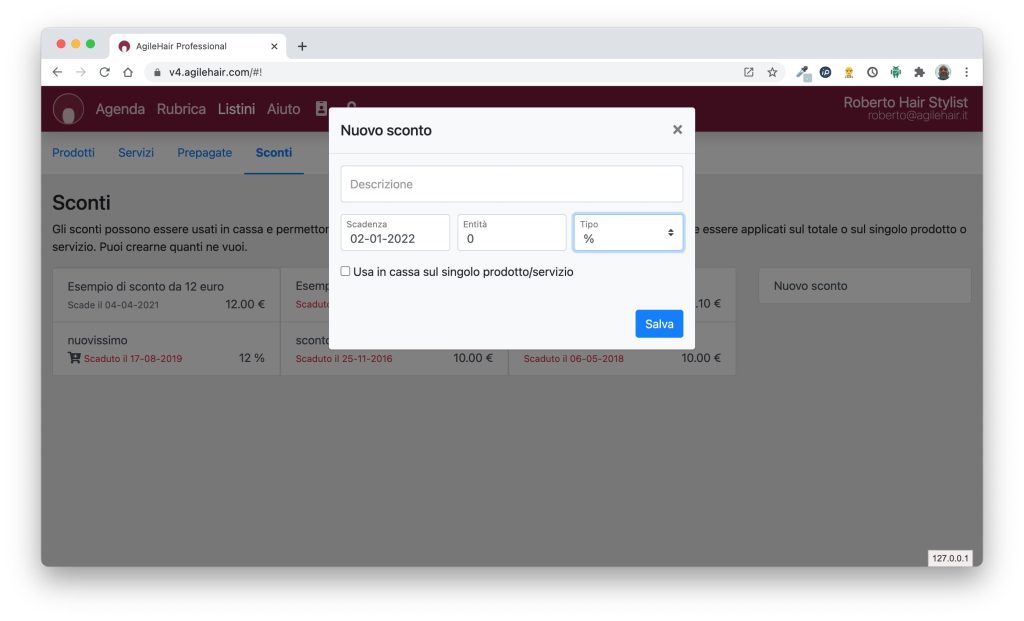 Gli sconti sono, assieme alle carte fedeltà, le prepagate e la raccolta punti, uno dei modi con puoi puoi gestire la fidelizzazione dei clienti ed anche il più semplice. Puoi trovarli dal menu Listini / Sconti. Per creare uno sconto occorre indicare: